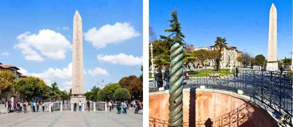 اوبلیسک ، معروف ترین در میان سه بنای تاریخی ، در سال 390 از مصر آورده شد و در مدت 31 روز در مکان فعلی خود ساخته شد. اوبلیسک ، قبل از میلاد حدود 1450 فرعون سوم مصر. ساخته شده برای توتموز به عبارت دیگر ، یکی از قدیمی ترین آثار در استانبول ایستاده است.این اثر که شاهد 3450 سال تاریخ بشریت است ، از نظر پایه و همچنین آثار کاملاً جالب توجه است. امپراتور روم شرقی Teodosius I و مردم نژادها را در یک طرف پایه سنگ مرمر به تصویر می کشیدند. همچنین می توان دید که چطور پوست ابلیس به جای نقش برجسته های این پایه نصب شده است.